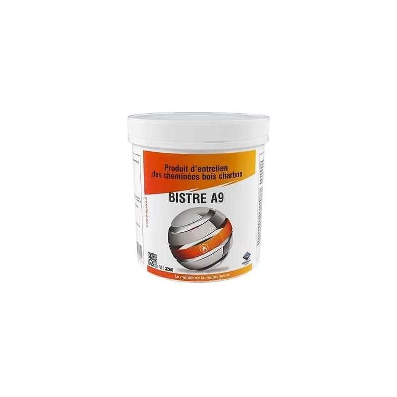 Onderhoudsproduct voor schoorsteenen1. BISTRE A9 is een poedervormig product verpakt in potten voor de reductie van bistres en teer in kachels, boilers, fornuizen, open haarden en inzetstukken2. De Bistre A9 wordt aanbevolen door professionals en zeer vaak gebruikt door schoorsteenvegers.3. Beperk de tocht tot een minimum om de behandeling te verlengen door de vrijgekomen dampen uit te stoten die met product zijn beladen.4. WEES VOORZICHTIG, HET GEBRUIK VAN BISTRE A9 SLUIT VERPLICHT MECHANISCH SCHOORSTEENVEGEN NIET UIT!5. Verpakking: 1kg DOOS