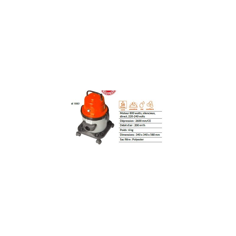 Compacte professionele stofzuiger, Eenvoudig in gebruik en ergonomisch dankzij de in de trolley geïntegreerde accessoirehouder. Het is mogelijk om het voor dubbele filtratie te gebruiken door het polyesterfilter en de meegeleverde papieren zak te combineren. De hoge kwaliteit van de gebruikte materialen garandeert maximale duurzaamheid in de tijd. Verbruiksartikelen: Pak van 10 papieren zakken (Ref. 1080ACC001).